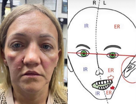 Яркий пример сколиоза костей черепа из-за мышечных дисбалансов, спазмов по всему телу ниже лица (хотя и на лице в том числе)